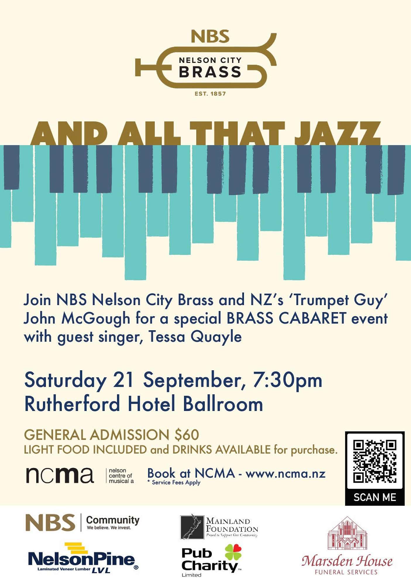 Don’t miss the NBS Nelson City Brass jazz and show cabaret ‘And all that Jazz’ at the Rutherford Hotel, 7:30pm on Saturday 21 September!!! Our last cabaret was a sell out – so don’t miss out on this fabulous evening of entertainment!