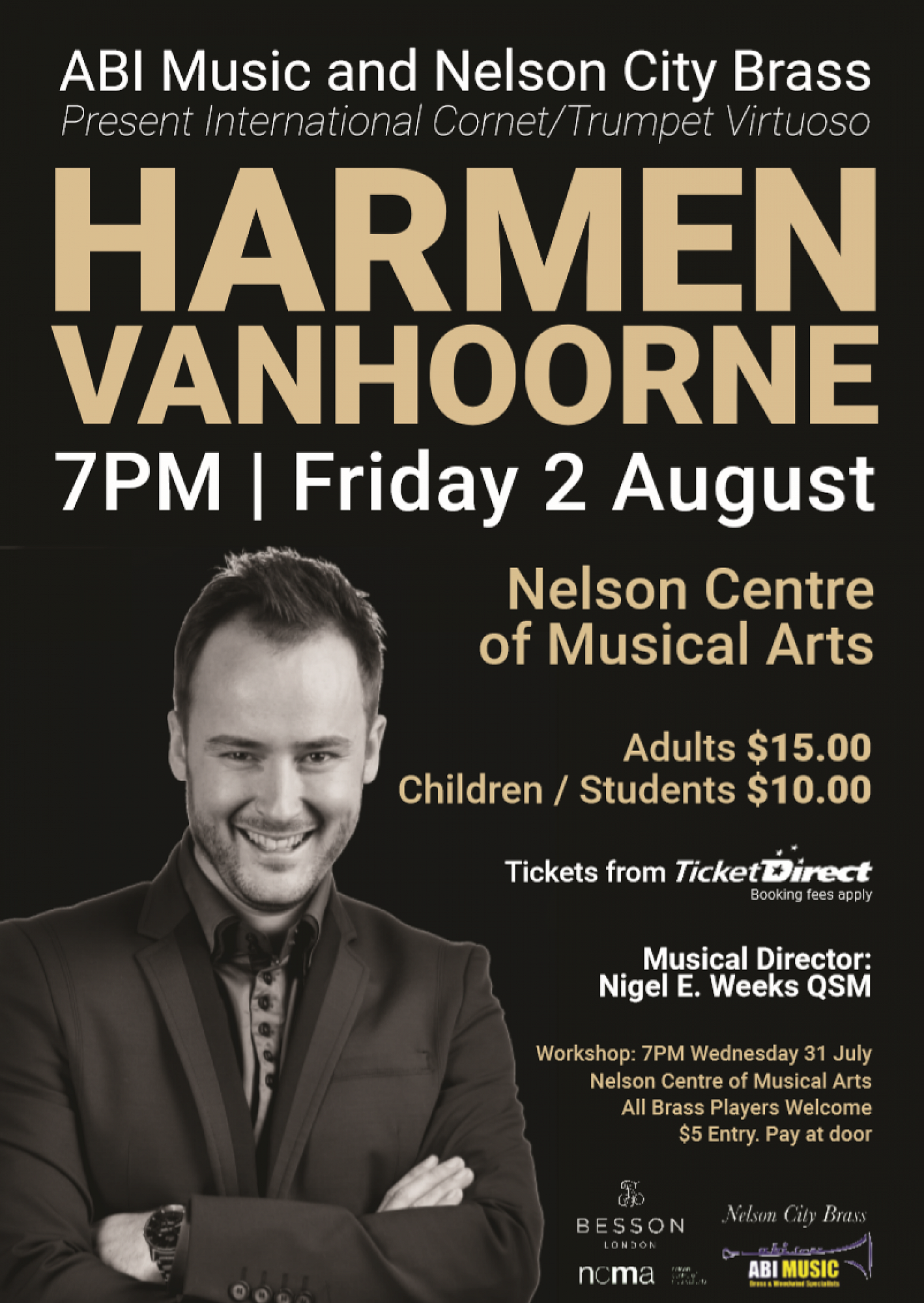 In conjunction with ABI Music/Besson don’t miss the opportunity to hear cornet/trumpet virtuoso Harmen Vanhoorne in concert with Nelson City Brass! Friday 2 August, 7:00pm at the Nelson Centre of Musical Arts (NCMA).